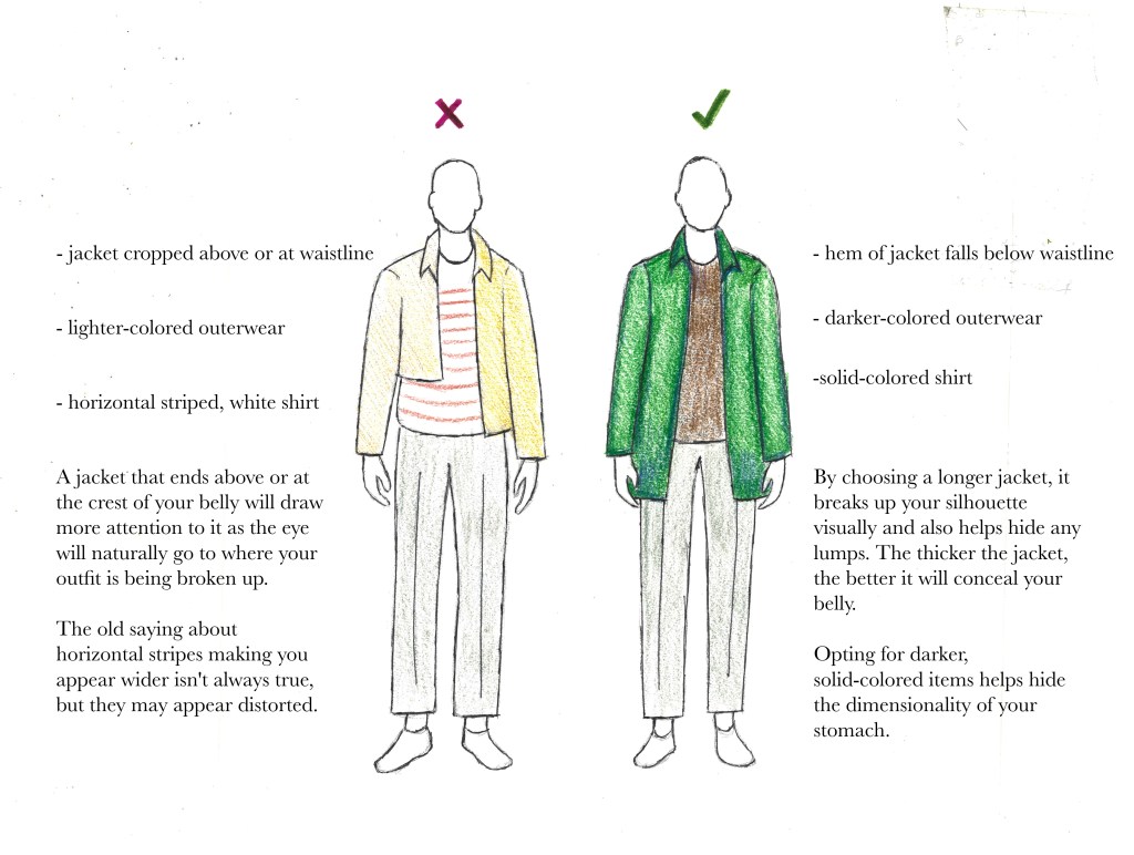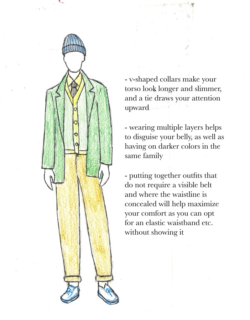 You can only de-emphasize your belly so much after a certain point, but I did manage to stealth mine quite far into my third trimester. These aren’t hard and fast rules, but rather general suggestions and guidelines for creating a masculine silhouette while pregnant. I drew out a few examples to help illustrate my points.