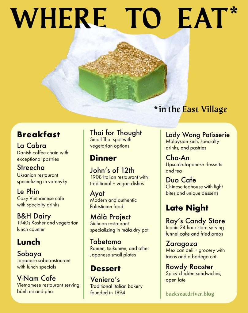 Even before I relocated my entire life to a two-block radius around Cooper Square, I always made my way to the East Village for weekend meals and after-work drinks. Over the past two years, I’ve spent thousands of dollars here, eaten several pounds of cold soba noodles, and drunk gallons of coarsely filtered sake, trying to determine which Google Map pins would be immortalized in both my memory and the in-app “favorites” list. Although I’m perfectly content to sprint across Astor Place on my lunch break to grab a salad from Wegman’s, there’s so much more the neighborhood can offer. This is by no means an all-encompassing or perfect list, but it’s my current guide to eating out in the East Village. I’ve broken it down into helpful sections you can navigate here: